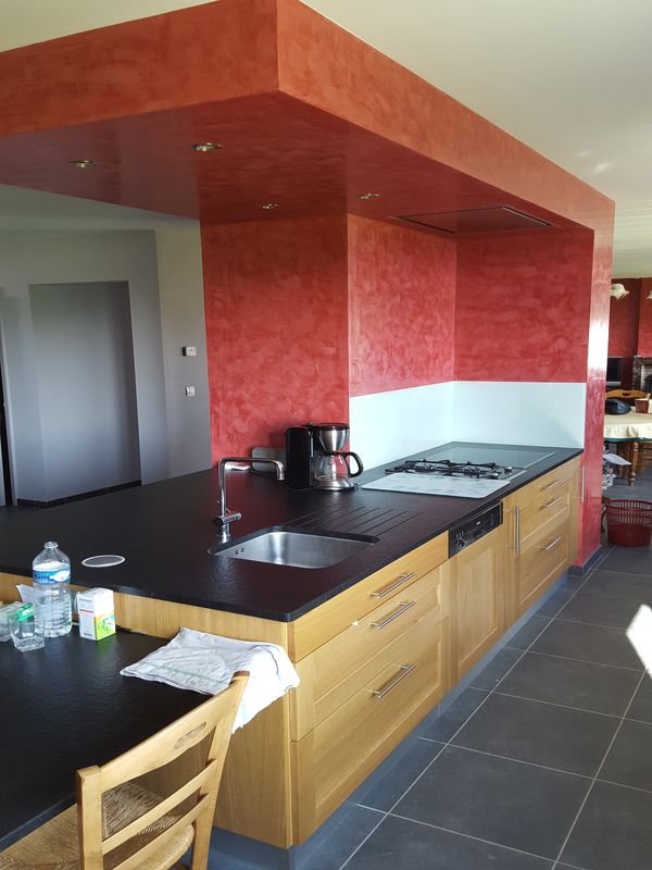 Plan de travail en granit noir fin flammé brossé épaisseur 3 cm.